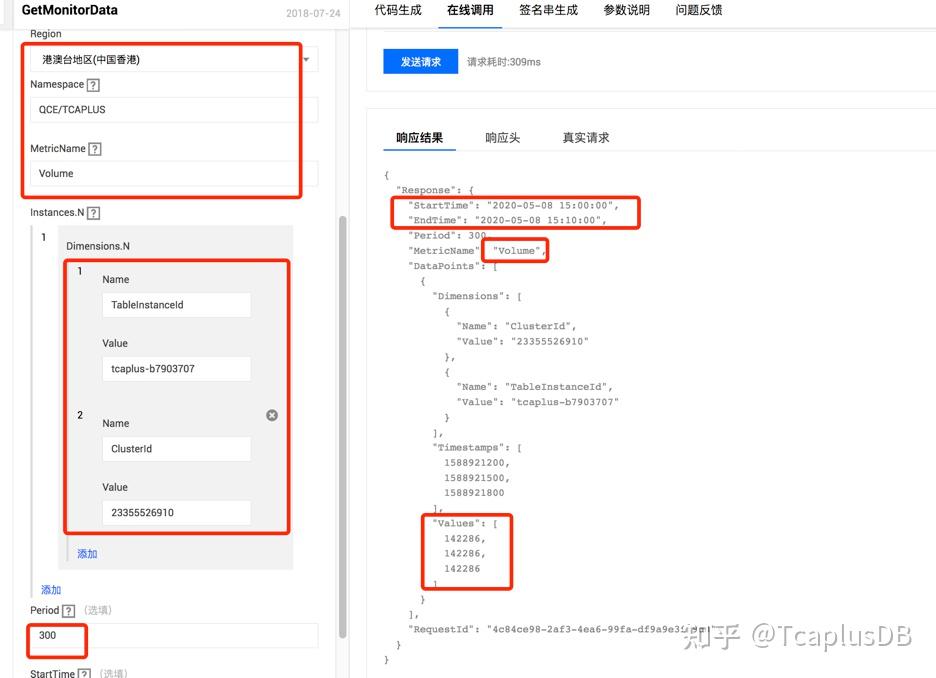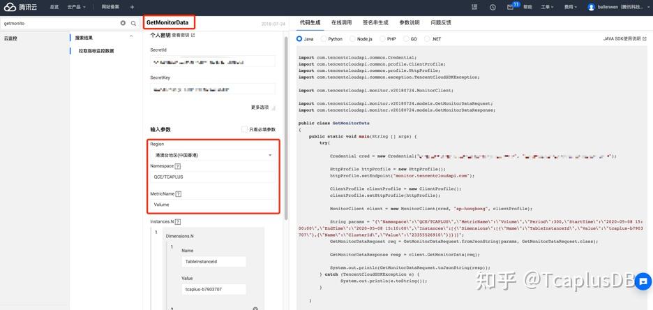 腾讯云提供了一个API在线使用的平台: API 3.0 Explorer。通过这个平台,用户可以方便在线测试对应产品的API接口调用逻辑。目前支持Java,Python, Node.js, PHP, Go和.Net等开发语言API ,只需在页面选择对应的API接口方法,填入对应方法参数后,定位到“在线调用”页面点击“发送请求”即可在线返回API的调用结果。API Explorer 支持两种方式API调用:一种是根据输入参数自动生成对应语言的调用代码,可以把这些代码放到自己的云环境机器中调用,方便更灵活的使用API; 另一种是根据输入参数自动生成Http调用代码,可直接在云环境机器用curl方式调用获取API返回结果。这里介绍下如何通过API Explorer来操作TcaplusDB及获取TcaplusDB表监控指标数据, 关于TcaplusDB表操作相关API请参考:TcaplusDB API, 关于监控数据获取API请参考: Monitor API。下面介绍下通过API Explorer 获取TcaplusDB表监控数据的例子。