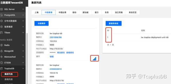 1) 打开表控制台,进入集群列表页面, 从页面获取Tcapdir IP(对应: Private Address/内网地址), Tcapdir PORT(对应:Private Port/内网端口),获取Zone ID (对应页面 : Table Group ID/表格组ID) 。