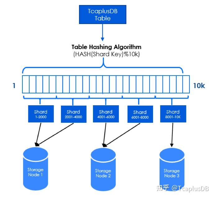 一个表通过HASH分表,按照路由数组长度(默认为10k)进行取模运算分片(Mod Sharding),所以每张表最多可以分成10k个分片(Shard)。以下图为例,1个TcaplusDB表被分为5个Shard文件分布到不同存储节点,每个结点分布有1个或多个分片的数据。