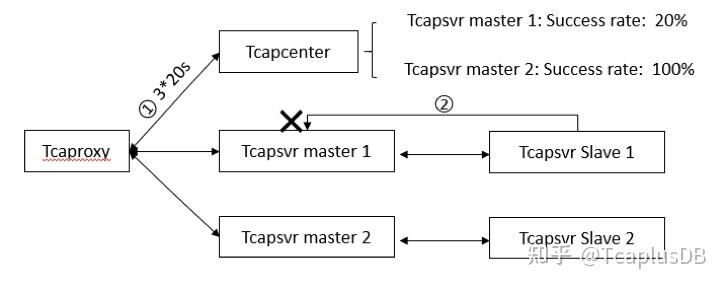- 存储层异常:tcapsvr Slave发生异常时会被一个新的Slave节点替换。如果tcapsvr master发生异常, Slave会切换成Master,切换过程中的用户请求失败,建议开发者增加重试逻辑代码。Master/Slave支持亚健康切换,读写错误率达到阈值时(默认80%)即进行主从切换,如下图: