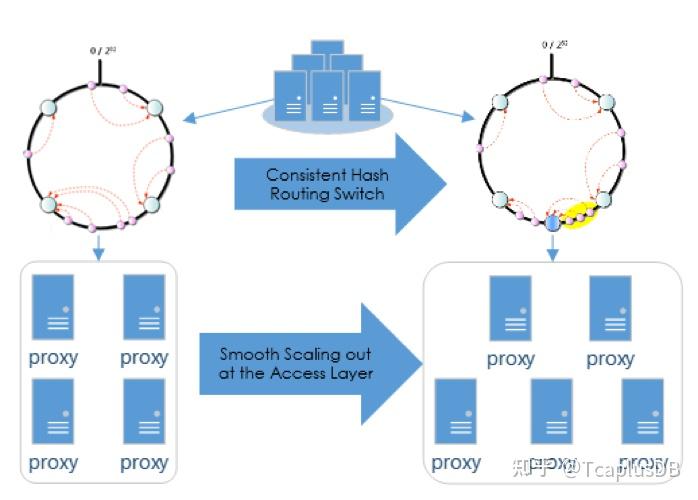 TcaplusDB API维护了一致性Hash环,当增加或者减少接入层节点时,TcaplusDB API会自动调整接入层tcaproxy的信息。