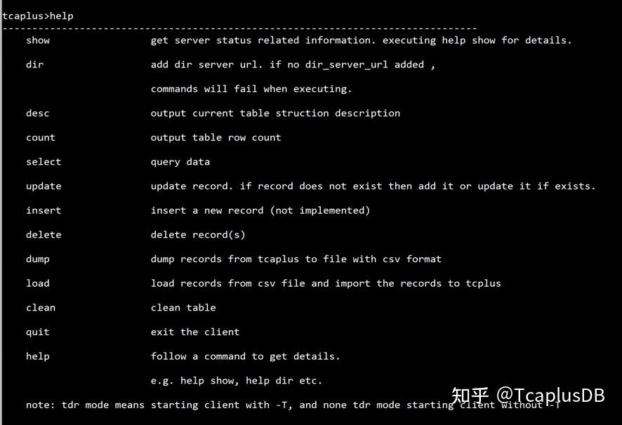您可以通过运行help或help +命令获得更多的TcaplusDB语法。 请注意,上表中未列出的命令正在逐步淘汰或不建议使用。