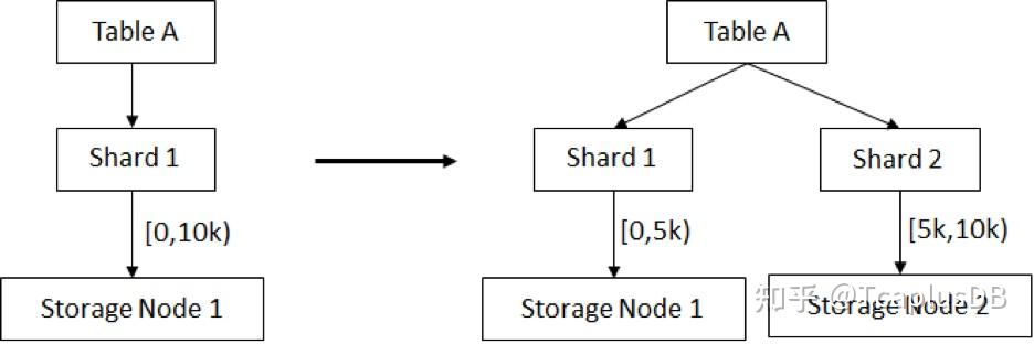 TcaplusDB扩容分别在存储层和接入层进行。从第2章节的架构图中,可以看到接入层即Tcap Proxy层,存储层即Tcapsvr层(主备节点)。对于接入层而言,采用的是无状态设计,所以可以灵活水平扩缩容,且不影响线上业务,对业务无感知 ; 对于存储层而言,由于表采用的是分片设计,在扩容时需要将原机器上的分片水平迁移到新机器上,达到扩容存储空间的目的。以图3.2为例,Table A在扩容前,只有一个分片Shard 1, 路由数组长度为10k。在扩容时,将该表分为两个分片,其中路由项0-5k放在Shard1 , 路由项5001-10k放在Shard2,2个shard分别存储到两个存储节点上。