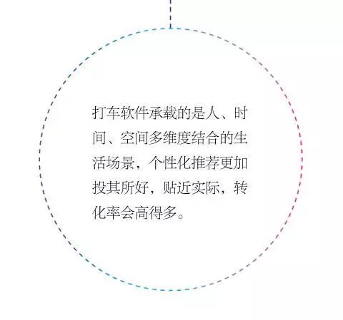 而掌握了某一群体特定时间的消费行为这件事则具有更大的想象空间,基于乘客目的地周边的商铺而提供的广告服务,也是滴滴快的未来业务一个最重要的落脚点。这或许将颠覆传统的互联网广告模式——传统的广告,消费者是比较被动的接受者,最终形成真实的购买行为的转化率很低,而打车软件承载的是人、时间、空间多维度结合的生活场景,个性化推荐更加投其所好,贴近实际,转化率会高得多。这个判断也来自于滴滴快的大量的数据分析,用户研究显示了其中30%有非常明确的商业需求,50%是潜在的消费群,那么滴滴快的就可以在用户出行途中来推送目的地的商铺优惠信息。