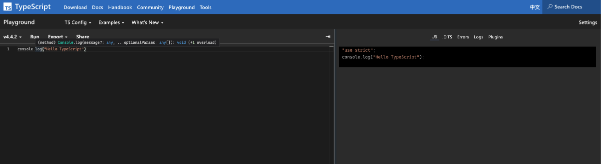 TypeScript 提供在线的 PlayGround,甚至还可以分享,比如以下代码的share url: https://www.typescriptlang.org/play?#code/MYewdgziA2CmB00QHMAUAiAEraSAEAKgJ4AOsAysAE4CWJALugJRA