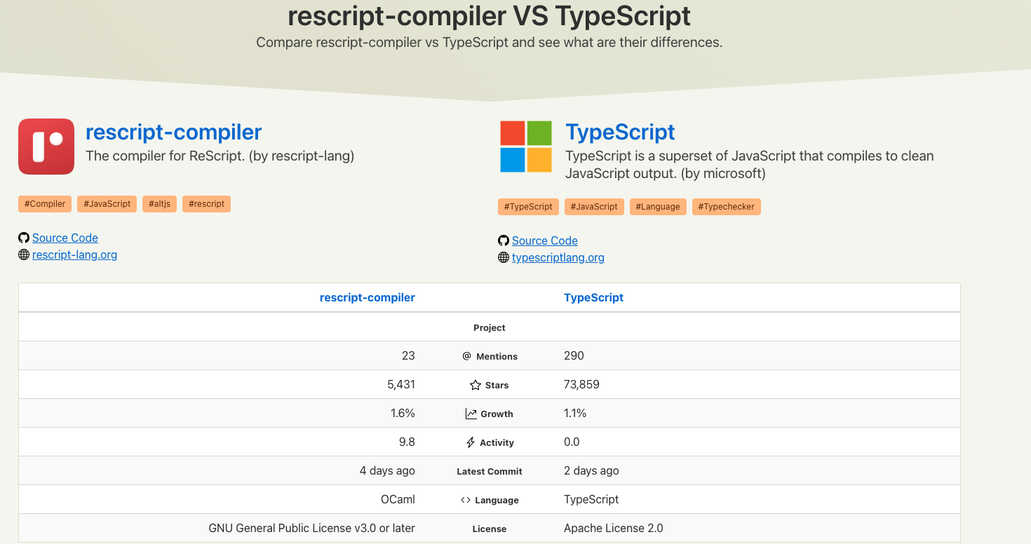 相信大家对 TypeScript 不陌生了吧,VS Code 就是使用 TypeScript 编写的,前端圈现在流传“任何能够用JavaScript实现的应用系统,最终都必将用TypeScript实现”,几乎所有的前端开源项目都在拥抱 TypeScript,简直是前端圈的“当红辣子鸡”。相比之下, ReScript 暂时没有这么有名气,但毕竟是属于未来的,尽管目前从 Github 的 star 数量来看,ReScript 还不足以撼动 TypeScript 近乎“垄断”的“统治地位”,但常言道“三十年河东,三十年河西”,着眼于未来,ReScript 目前是“最被低估的技术”。从另一个角度来看, ReScript 的核心开发者如同 Vue.js 一样就有熟悉的中文姓名–张宏波,笔者在这里也希望 ReScript 也会拥有强大的中文社区。