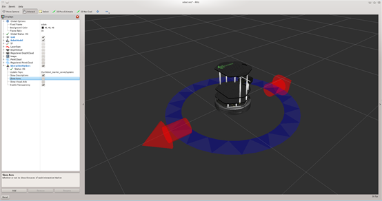 检查“交互式标记”显示组件,然后在屏幕顶部的工具调色板(如下所示)中选择“交互”工具,为turtlebot调出交互式标记。