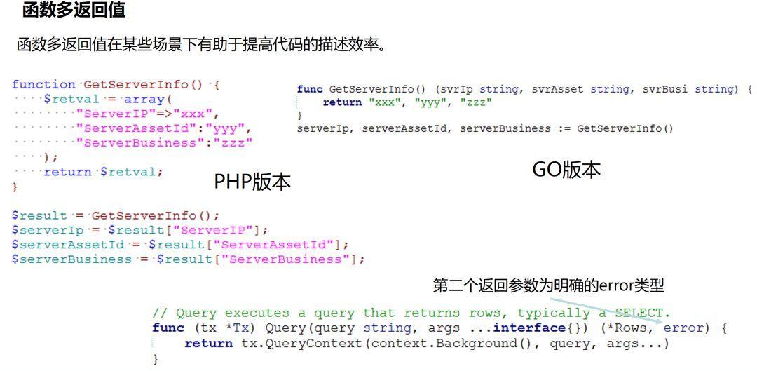 在语言中支持函数多返回值,并不是什么新鲜事,Python就是其中之一。允许函数返回多个值,在某些场景下,可以有效的简化编程。GO语言推荐的编程风格,是函数返回的最后一个参数为error类型(只要逻辑体中可能出现异常),这样,在语言级别支持多返回值,就很有必要了。