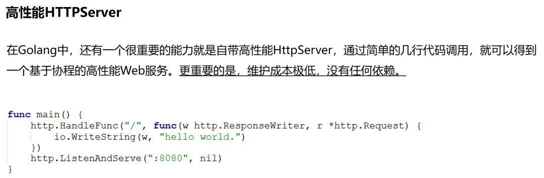 作为出现在互联网时代的服务端语言,面向用户服务的能力必不可少。GO在语言级别自带HTTP/TCP/UDP高性能服务器,基于协程并发,为业务开发提供最直接有效的能力支持。要在GO语言中实现一个高性能的HTTP Server,只需要几行代码即可完成,非常简单。