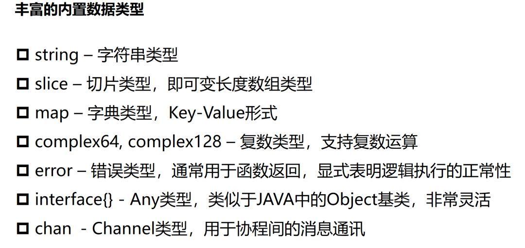 GO语言作为编译型语言,在数据类型上也支持得非常全面,除了传统的整型、浮点型、字符型、数组、结构等类型外。从实用性上考虑,也对字符串类型、切片类型(可变长数组)、字典类型、复数类型、错误类型、管道类型、甚至任意类型(Interface{})进行了原生支持,并且用起来非常方便。比如字符串、切片类型,操作简便性几乎和python类似。