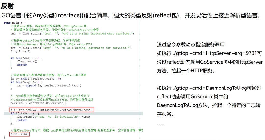 Golang作为强类型的编译型语言,灵活性上自然不如解析型语言。比如像PHP,弱类型,并且可以直接对一个字符串变量的内容进行new操作,而在编译型语言中,这显然不太可能。但是,Golang提供了Any类型(interface{})和强大的类型反射(reflect)能力,二者相结合,开发的灵活性上已经很接近解析型语言。在逻辑的动态调用方面,实现起来仍然非常简单。既然如此,那么像PHP这种解析型语言相比于GO,优势在那里呢?就我个人而言,写了近10年的PHP,实现过开发框架、基础类库以及各种公共组件,虽然执行性能不足,但是开发效率有余;而当遇上Golang,这些优势似乎不那么明显了。