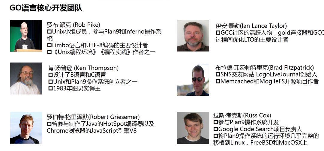 GO语言的开发阵营可以说是空前强大,主要成员中不乏计算机软件界的历史性人物,对计算机软件的发展影响深远。Ken Thompson,来自贝尔实验室,设计了B语言,创立了Unix操作系统(最初使用B语言实现),随后在Unix开发过程中,又和Dennis Ritchie一同设计了C语言,继而使用C语言重构了Unix操作系统。Dennis Ritchie和Ken Thompson被称为Unix和C语言之父,并在1983年共同被授以图灵奖,以表彰他们对计算机软件发展所作的杰出贡献。Rob Pike,同样来自贝尔实验室,Unix小组重要成员,发明了Limbo语言,并且和Ken Thompson共同设计了UTF-8编码,《Unix编程环境》、《编程实践》作者之一。