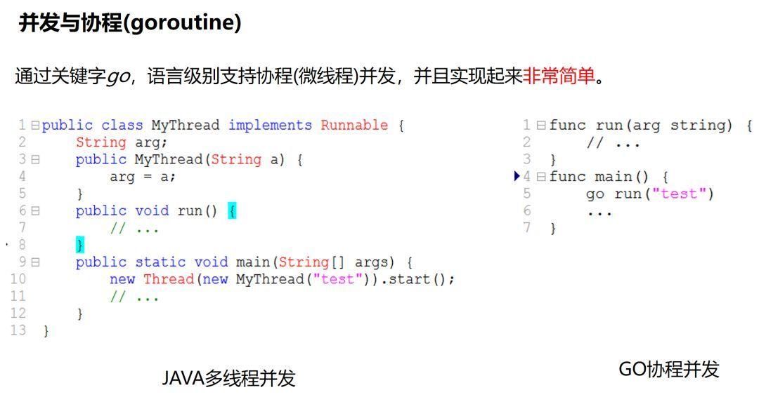 对比JAVA的多线程和GO的协程实现,明显更直接、简单。这就是GO的魅力所在,以简单、高效的方式解决问题,关键字go,或许就是GO语言最重要的标志。