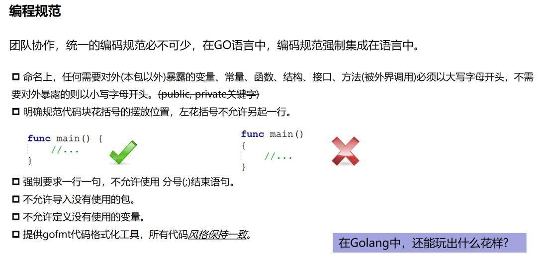 GO语言的编程规范强制集成在语言中,比如明确规定花括号摆放位置,强制要求一行一句,不允许导入没有使用的包,不允许定义没有使用的变量,提供gofmt工具强制格式化代码等等。奇怪的是,这些也引起了很多程序员的不满,有人发表GO语言的XX条罪状,里面就不乏对编程规范的指责。要知道,从工程管理的角度,任何一个开发团队都会对特定语言制定特定的编程规范,特别像Google这样的公司,更是如此。GO的设计者们认为,与其将规范写在文档里,还不如强制集成在语言里,这样更直接,更有利用团队协作和工程管理。