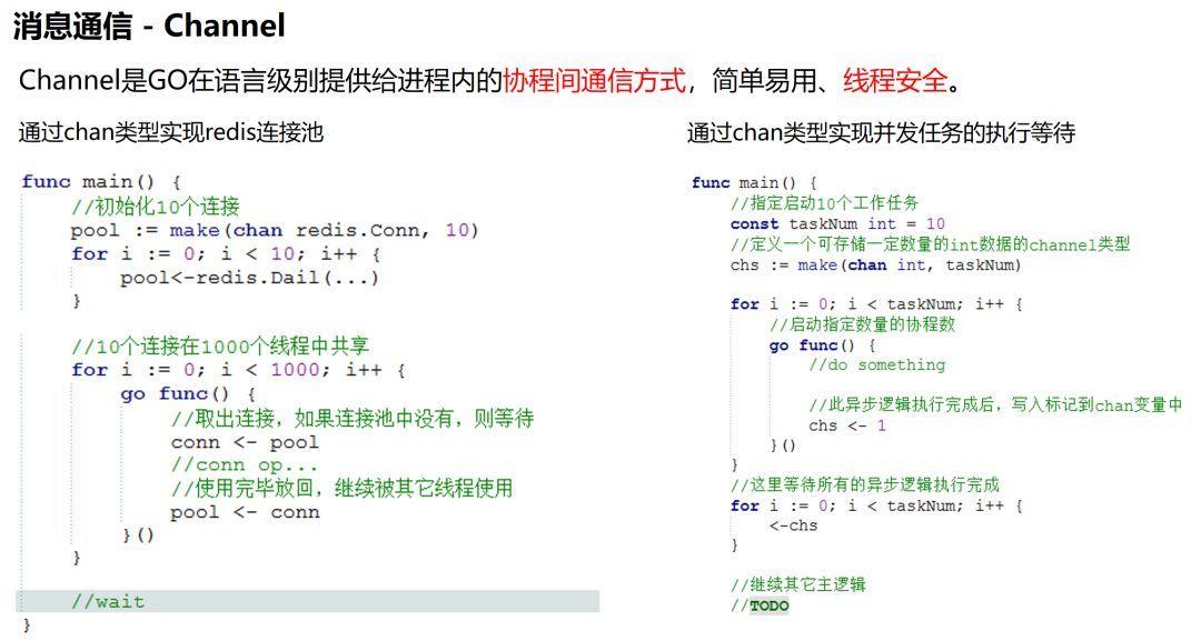 在异步的并发编程过程中,只能方便、快速的启动协程还不够。协程之间的消息通信,也是非常重要的一环,否则,各个协程就会成为脱缰的野马而无法控制。在GO语言中,使用基于消息传递的通信方式(而不是大多数语言所使用的基于共享内存的通信方式)进行协程间通信,并且将消息管道(channel)作为基本的数据类型,使用类型关键字(chan)进行定义,并发操作时线程安全。这点在语言的实现上,也具有革命性。可见,GO语言本身并非简单得没有底线,恰恰他们会将最实用、最有利于解决问题的能力,以最简单、直接的形式提供给用户。