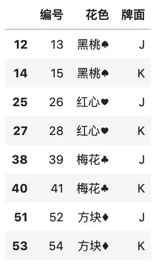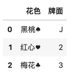 为了演示增加行的方法,我们首先创建一个新的数据框,其中包含一张扑克牌,我们使用 append() 函数把这张新牌增加到数据框中去。