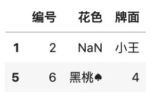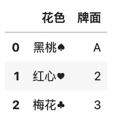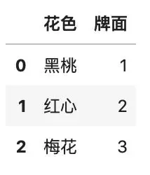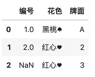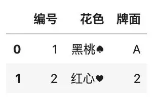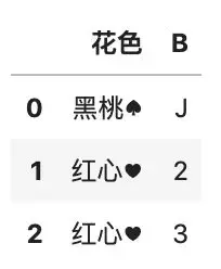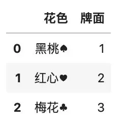 df.insert(1, \'花色\', [\'黑桃♠\', \'红心♥\'])