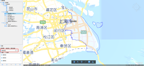 5.左下角搜索栏搜索浦东新区,图中则会显示出浦东新区的行政区划范围。