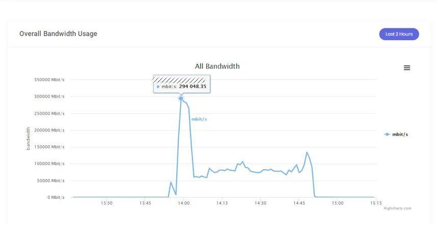 这也是 A 记黑客组织一贯的攻击套路,通常先进行小规模攻击试探,并威胁企业支付“赎金”,如果被拒便会发起更为猛烈的大流量攻击,以此胁迫企业就范。黑客与 G 先生谈崩以后,恼羞成怒,在当天下午 2 点钟左右便开始发动猛烈的攻势。攻击流量瞬时达到了近 300G 的峰值!