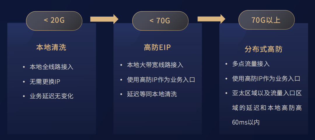 对此,UCloud推出了一套基于全球清洗能力的全球分级解决方案。在攻击的量级在20G以下的时候,推荐使用本地清洗;在70G以下的时候,推荐使用高防EIP;而如果攻击流量达到70G以上,则推荐使用分布式高防,即UCloud亚太高防和Anycast全球清洗。