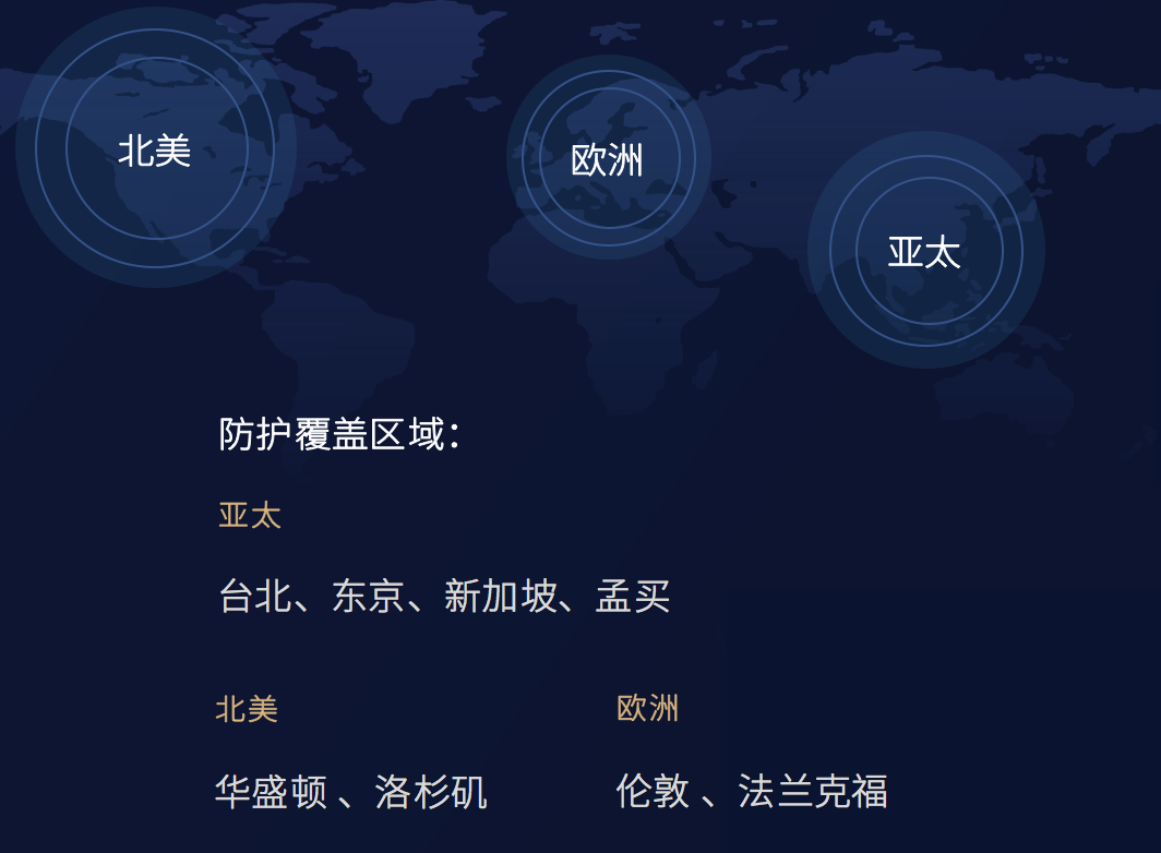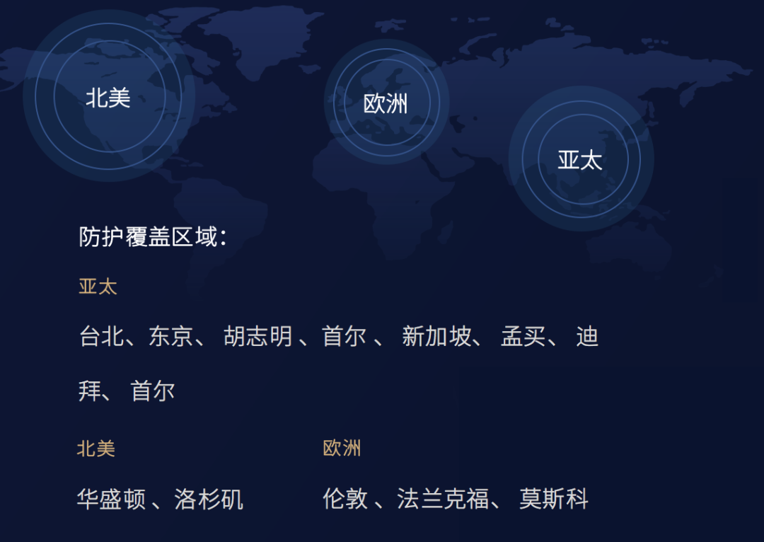 亚太高防采用的思路就是用单独的高防机房进行清洗之后,通过公网进行回源。目前我们的高防机房位于香港,因此它覆盖东南亚的效果相当不错,从香港去覆盖台北、新加坡、越南、首尔、雅加达等地域最高的延时也不会超过60毫秒。此外从用户体验上,也可以像普通EIP一样直接绑定在用户的资源上,只会增加一点额外的延时。相对于普通的高防产品,亚太高防没有域名和端口的限制,也没有QPS的数量限制,因此非常适合用于大带宽的DDoS攻击相关的防御。