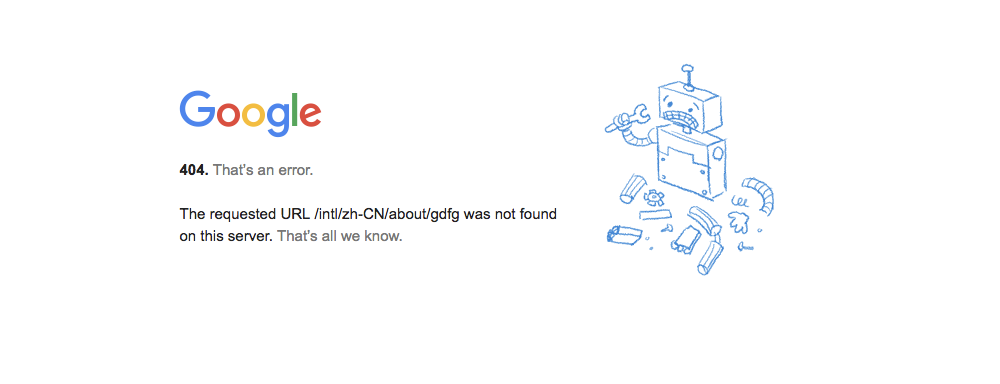 Google 官网的 404 界面是一个散架的机器人和一行文字标注,创意方面中规中矩,也简洁明了。