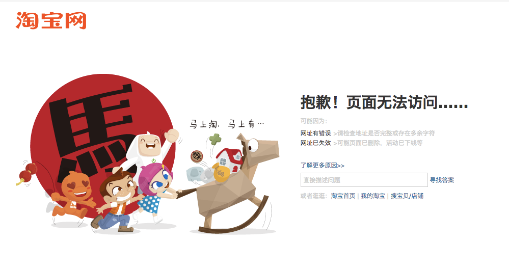 淘宝的 404 页面是一个“马”和四个小人驾着一辆木马车,可能是想表达马上淘、马上有的意思,可是为什么我直接想到了马云呢?