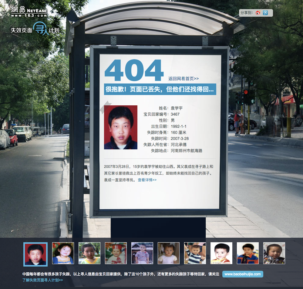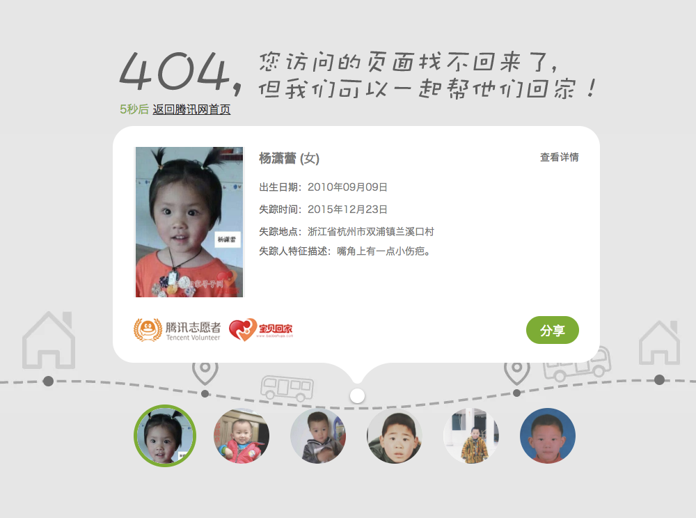 腾讯、网易的官方网站都将 404 页面设成了寻找失踪儿童,这里体现了大厂的人情味,也希望所有走丢的孩子都能找到自己的家。