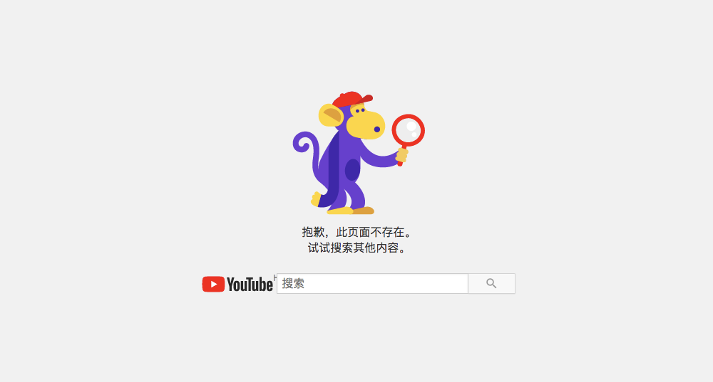 YouTube 的 404 页面是一直表情呆滞猴子,拿着放大镜似乎在寻找些什么。此外 YouTbe 还将搜索栏与 404 页面结合在一起了。