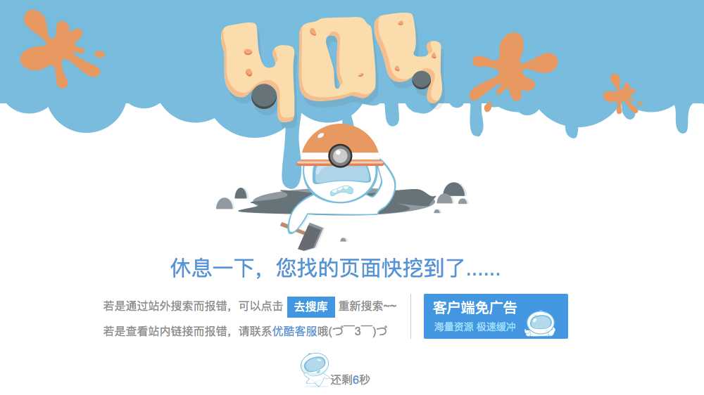 优酷的 404 页面则是一个迷路的地下隧道挖掘工,脸上带着迷惑。