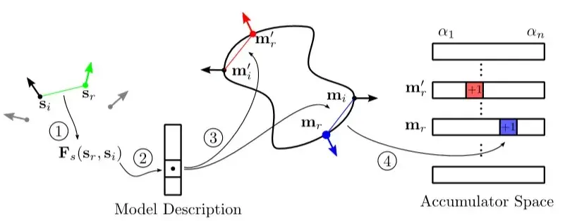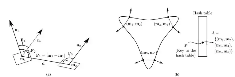 这篇文章是PPF的鼻祖,发表在2010年CVPR。其构建两点及其法向量之间的几何关系形成的四维特征作为点对特征(Point Pair Features)。线下建立哈希表存储模型的所有四维特征作为模型的整体描述。线上匹配阶段,借用全局坐标系简化刚体变换自由度,使得位姿计算变得简单。同时借助广义霍夫变换的投票思想,对参数空间投票,获得可靠位姿。