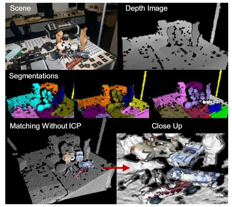 之前的PPF系列方法虽然是有所改进,但是总体的pipeline几乎是一致的。而Birdal等人在2015年从pipeline上改进了PPF。文章将目标检测与一个由粗到精的分割结合起来,其中每个分割都需要进行独立的位姿估计。在匹配过程中,使用了一个加权的霍夫投票和一个插值恢复的位姿参数。最后,所有生成的假设通过一个遮挡感知排序进行检验和排序。特别的是,由于这种增强的位姿检索,新的pipeline不需要ICP优化,从而在速度和精度之间取得更好的折衷。