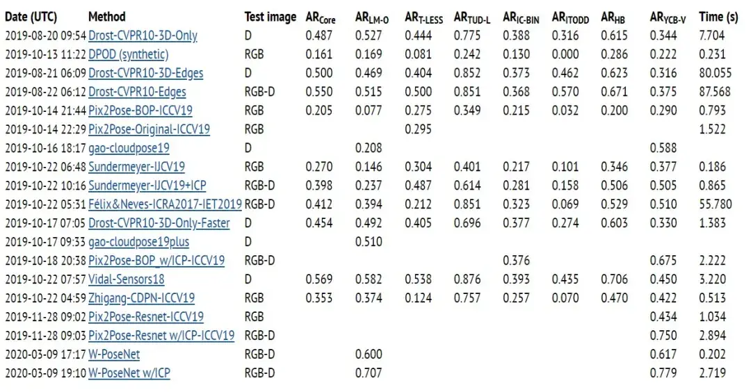 2019年ICCV在韩国举行的"6D Object Pose Estimation Challenge" 中,基于PPF的方法丝毫不输当今火热的深度学习类方法。下图是Leaderboard,其中Drost和Vidal的方法都是基于PPF。