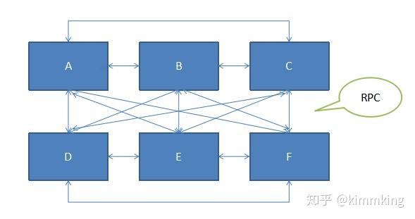 如果有N个不同系统相互之间都有RPC调用,这时候整个系统环境就是一个很大的网状结构,依赖关系有N*(N-1)/2个。任何一个系统出问题,都会影响剩下N-1个系统,怎么降低这种耦合呢?如图1-8所示: