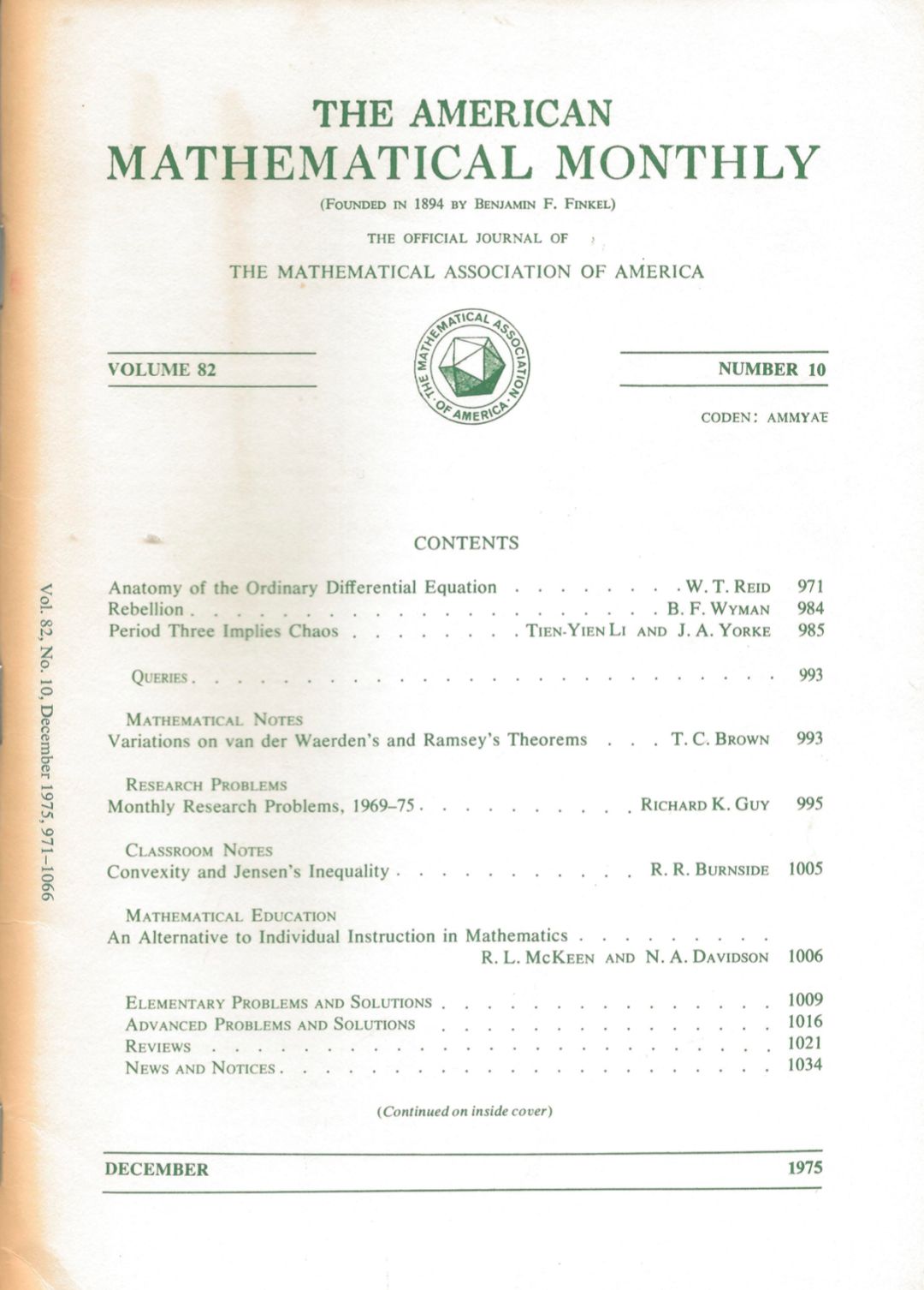 1975年12月《美国数学月刊》封面,第三篇为李天岩和约克合作的《周期三则意味着混沌》。