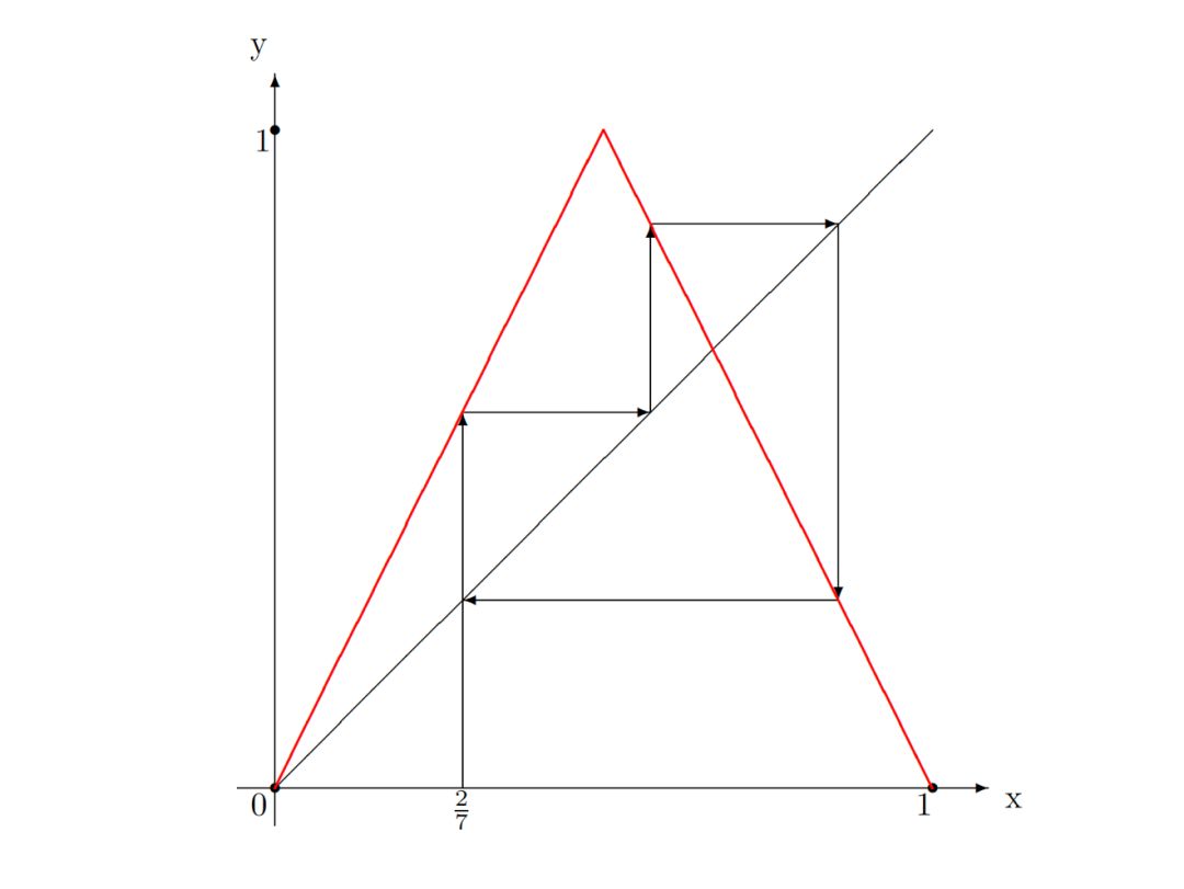 若实数轴一区间到其自身的连续函数f有一个周期为三的点,即存在三个互不相等的数a、b、c,使得函数 f在 a的值为 b,在b的值为c,在c的值为a,则对任意正整数n,函数f有一周期为n的点,即从该点起函数f迭代n次后又第一次返回到该点。更进一步,对“不可数”个的初始点,函数从这些点出发的“迭代点数列”之最终走向将是杂乱无章的,无规律可循。