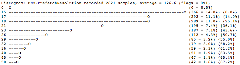 上面的直方图显示出了DNS预获取请求延迟的分布情况:大约50%的(最右侧列)预获取查询在20毫秒内完成(最左侧列)。注意,这是基于最近的浏览会话(9869个样本)的统计得到的,并属于用户的隐私数据。如果该用户选择报告Chrome的使用统计数据,则这些数据的摘要会被匿名处理,定期反馈给开发团队,他们就可以看到试验的效果并进行相应的调整。