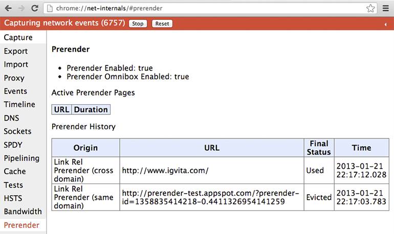 想看看这是如何实现的吗?可以访问prerender-test.appspot.com上还在开发中的演示版,要查看你的profile的预呈现页面的历史记录和状态,访问:chrome://net-internals/#prerender。(见图1.11)