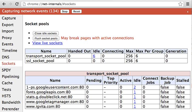 Chrome在chrome://net-internals#sockets中提供了一个工具可以查看Chrome中所有已开启socket的状态。图1.10是相关的截图。