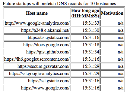 Chrome会记住用户在浏览器启动后前10个最有可能访问的主机名——注意这并不是前10个全局目标站点,而特指全新开启浏览器之后的目标站点。浏览器加载时,Chrome可以为这些可能的目标站点触发DNS预获取行为。如果你对此感兴趣,可以打开一个新标签页浏览地址chrome://dns,看一看你自己的启动主机名列表。在页面顶端,你会找到你profile的前10个最可能启动站点。