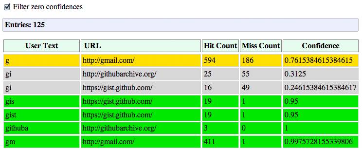 Chrome会维护用户输入前缀、建议行为以及每一记录的命中率的历史记录。在我的profile中,你可以看到当我在Omnibox中输入“g”时,有76%的可能性我是要访问Gmail。而当我加了一个“m”之后(变成“gm”),则置信水平上升到99.8%,实际上,在记录的412次访问中,我只有一次在输入“gm”之后没有访问Gmail。