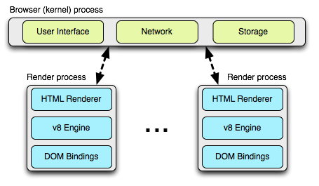 这些呈现进程的每一个都在一个沙盒环境内执行,这个环境对用户计算机——包括网络,只有有限的访问权限。要获得访问这些资源的权限,每个呈现进程要与主浏览器进程(或称为内核进程)进行通信,由内核进程负责管理每个呈现器的安全和权限策略。