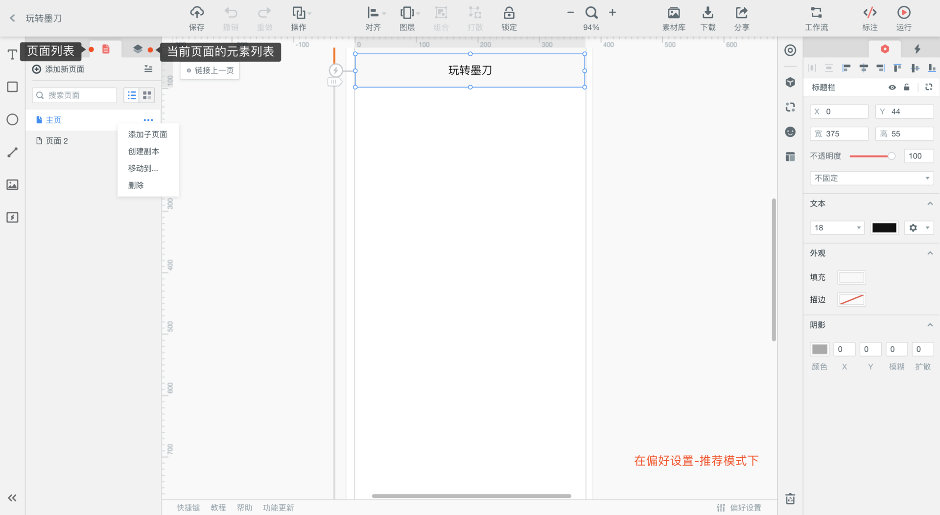 在偏好设置-推荐模式下,页面列表位于工作区的左侧,与元素列表并排。