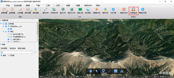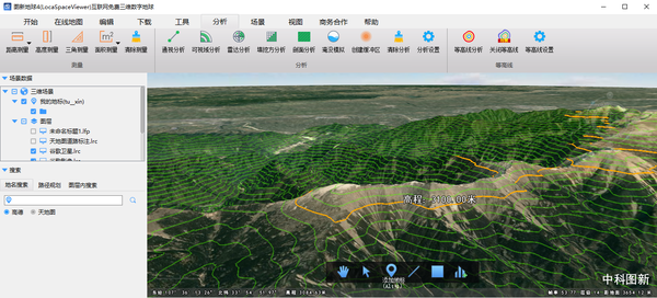 图新地球还有个开启等高线的功能,但位置却和等高线生成不在一块,令人困惑。 在分析菜单下点击“开启等高线”即可实时显示等高线。