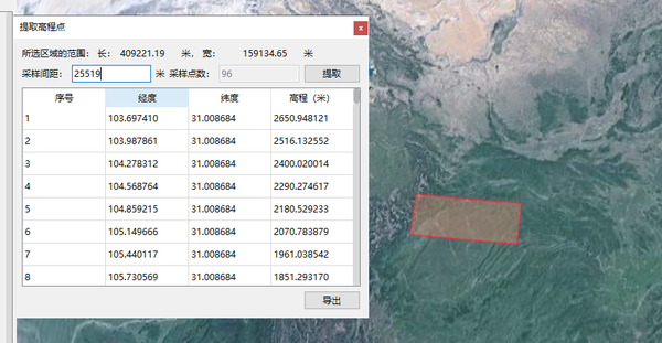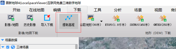 在主菜单“下载”-“提取高程”,点击即可提取。 框选任何范围或点击选择面,即可生成,不过前提是加载了地形数据。