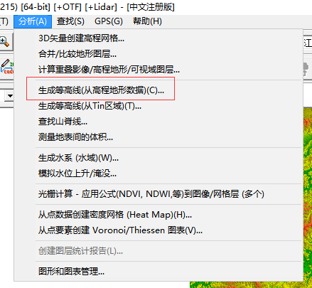 首先用Global Mapper打开dem数据后,在菜单“分析”中点击生成等高线。