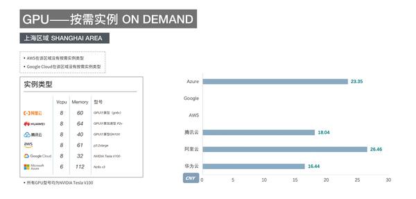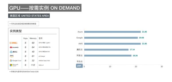 GPU的按需实例价格:华为云价格最低为16.44元/时,腾讯云次之18.04元/时,AWS为36.08元/时最高。