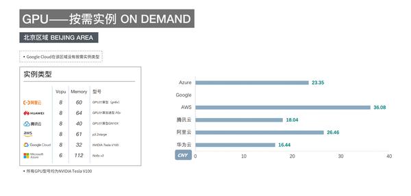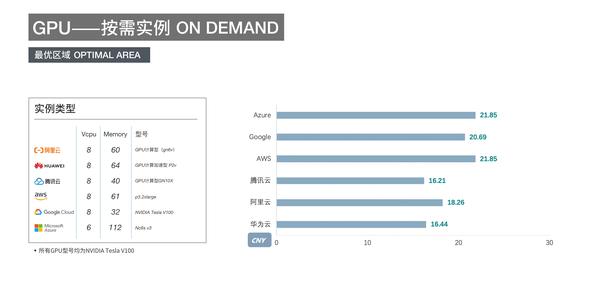 1. Google Cloud的GPU产品计价与其他五家云厂商略有不同,他家的GPU的价格是单独列出的,而其他厂商都是打包套餐价格(包括CPU/内存/GPU)。因此我们统计的Google Cloud GPU产品是包含了GPU并配备了vCPU和内存的总价格。