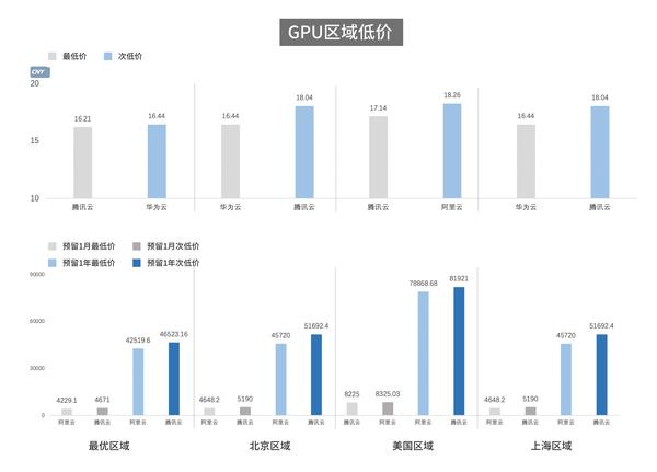 在GPU产品的对比中,国内厂商几乎包揽了所有区域的最低价和次低价,以按需价格为例,最优区域的最低价和次低价分别为腾讯云和华为云,北京区域为华为云和腾讯云,美国区域为腾讯云和阿里云,上海区域为华为云和腾讯云。