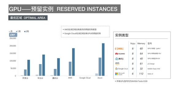 GPU的预留实例价格:按月价格,腾讯云与阿里云均较低。按1年/3年价格,阿里云最低,Azure最高。